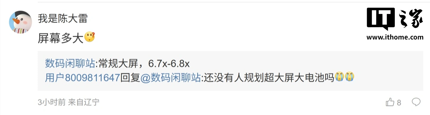 后续有用户在评论区询问:“Turbo5Pro 电池有没有 9”,博主回复道:“你猜”;另一名用户则询问道:“屏幕多大”,博主回复道:“常规大屏,6.7x-6.8x”;而另外一名网友则询问道:“GT2pro 不是说有金属中框吗”,博主则回复道:“有啊,GT 系列定位是中高端,毕竟 8E+8E5 旗舰芯”。